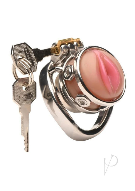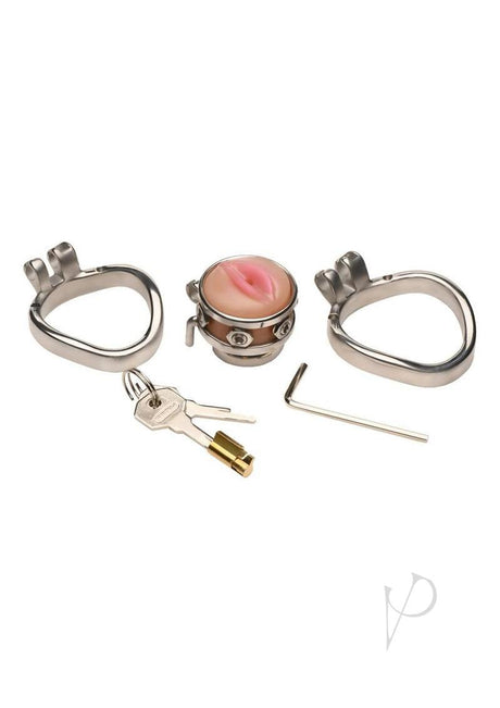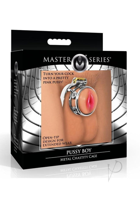 Master Series Pussy Boy Metal Chastity Cage Stainless Steel - Silver/Vanilla