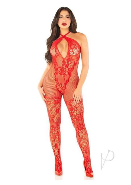 Leg Avenue Seamless Net and Lace Lingerie Jumpsuit with Keyhole Crossover Halter - OS - Red