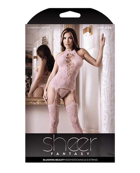 Sheer Fantasy High Neck Floral Lace Gartered Bodystocking & Panty Light Pink O/S