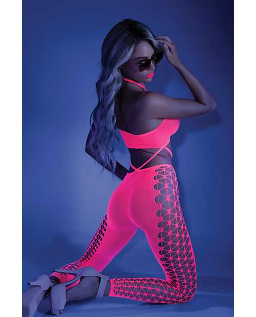 Glow Black Light Cropped Cutout Halter Bodystocking Neon Pink O/S