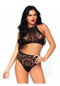 Leg Avenue Crochet Lace Halter Crop Top with Strappy Back Detail and High Waist Thong Panties (2 Piece) - Black - Small/Medium