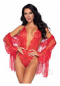 Leg Avenue Floral Lace Teddy with Adjustable Straps and Cheeky Thong Back Matching Lace Robe with Scalloped Trim and Satin Tie (3 pieces) - Large - Red