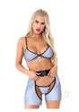 Leg Avenue Reflective Bikini Top, G-String Panty, and Buckle Biker Chaps - Silver - Small/Medium is backordered and will ship as soon as it is back in stock.