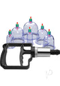 Directly stimulate just about any spot on your body with an easy-to-use cupping set. With six cups in graduated sizes, you can experiment with powerful suction and increased sensitivity! Stemming from Chinese medicine, this unique method of relieving sore and aching muscles also makes for an erotic massage, intense BDSM play, or an exciting exploration of self-pleasure. Simply place one or more cups directly onto the skin, creating a strong seal, and attach the handheld pump to the green and red tip of the cup. Pull the pump trigger to create suction, working towards your comfort level. Lubricate the skin first in order to slide the cups around for different sensations. The pump may be detached and the cups will still remain attached to the skin by the vacuum. Acu-Points centered at the top of the cups provide additional stimulation against the skin, should you choose to pump that far. When you are finished, the pressure released easily by pressing on the red tip.
