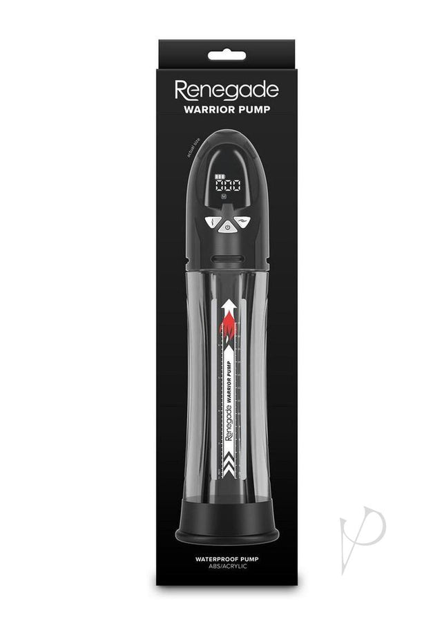The Renegade Warrior Pump a revolutionary, waterproof pump that can be used in the tub, shower, pool, and more. Fill up the chamber with water for a wet and wild pumping session. Warrior features an LCD screen to gauge each session, an 8-inch long by 2.75-inch acrylic cylinder, a TPE donut sleeve, and an ABS handle for effortless use. 4 intensity settings / 4 patterns. Rechargeable. Suitable with all lubricants.