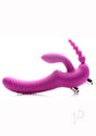 Ergonomically designed for the female body, this strapless strap-on provides clitoral, vaginal, and anal pleasure to the wearer while delivering a textured shaft with which to penetrate their partner. Furthermore, this remarkable couples toy thrums throughout all stimulation points with the power of two vibrating bullets. The bottom will appreciate a rippled, slightly curved shaft, perfect for stimulating the G-spot or P-spot. Meanwhile, the clitoral pad has two ridges that provide immense pleasure to the top with every thrust. A smooth penetrator is curved to directly target their G-spot, as well. Finally, the beaded anal stimulator provides a thrill of ecstasy as the seamless bulbs hum delightfully. This all-inclusive tool is waterproof, for enjoyment in all settings and an easy clean with mild soap and water. Made of premium silicone, it is non-porous, phthalate-free, and not compatible with silicone lubricants.